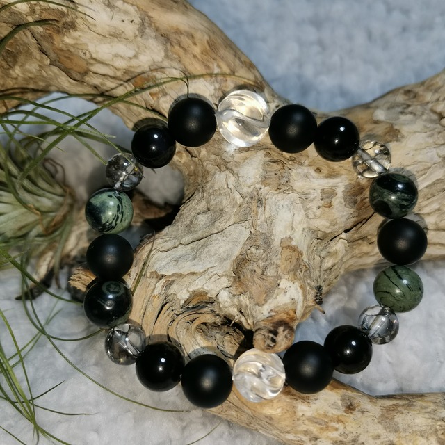 シックな黒系メンズブレスレットです ウェーブ水晶と、黒のクラック水晶がアクセントです。 カンババジャスパー10mm レインボーオブシディアン10mm フロストオニキス10mm 黒クラック水晶8mm ウェーブ水晶12mm、10mm カンババジャスパーには高いヒーリング効果があり、精神を落ち着かせ、安らかで穏やかな心の状態へと導いてくれるとされます。大地のエネルギーを持つ石であり、このエネルギーが持ち主の不安を取り去って未来へ前進して行く力を与えてくれると言われます。また、この大地のエネルギーが自然の力を活性化するため、植物の成長を促すとも言われます。 レインボーオブシディアンは、道を照らすという石言葉を持った天然石です。 レインボーオブシディアンは優柔不断な感情を取り払い、直観力や決断力を高めてくれるとされています。 また、トラブルなどに巻き込まれた際にこの石を手にして瞑想すると、現状を打開するアイディアが生まれると生まれると言われています。 マイナス思考やトラウマ、破壊衝動や攻撃性といった感情面のマイナスなエネルギーを取り除き、自分を向き合って精神的な成長を促してくれます オニキスは、人生において幾度も降りかかる辛い場面、苦しい面においても諦めず、前に進むための忍耐力や意思の強さ、やり遂げる力を与えてくれます。そのため、成功の象徴とも呼ばれています。 オニキスの大きな得意分野は、魔除け、邪念や邪気を祓うという点です。 悪しきものをはねのけ、持ち主を外からのアタックから守る効果と、自分自身の中にある邪、つまり悪い感情や惰性に打ち克つ意味とがあります。